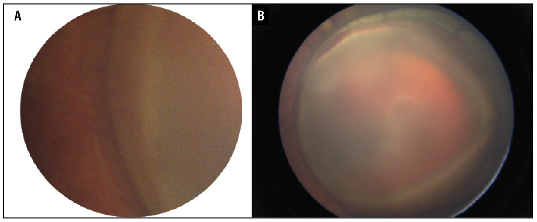 In another case, Dr. Campbell reported on an ex-26-week premature baby presenting as a near 40-week old baby with retinopathy of prematurity with continued progression after laser treatment. Exam under anesthesia revealed stage 4 retinal detachments (Figure 2A). Fluorescein angiography revealed a fibrovascular membrane with leakage at the disc and arcades (Figure 2B).