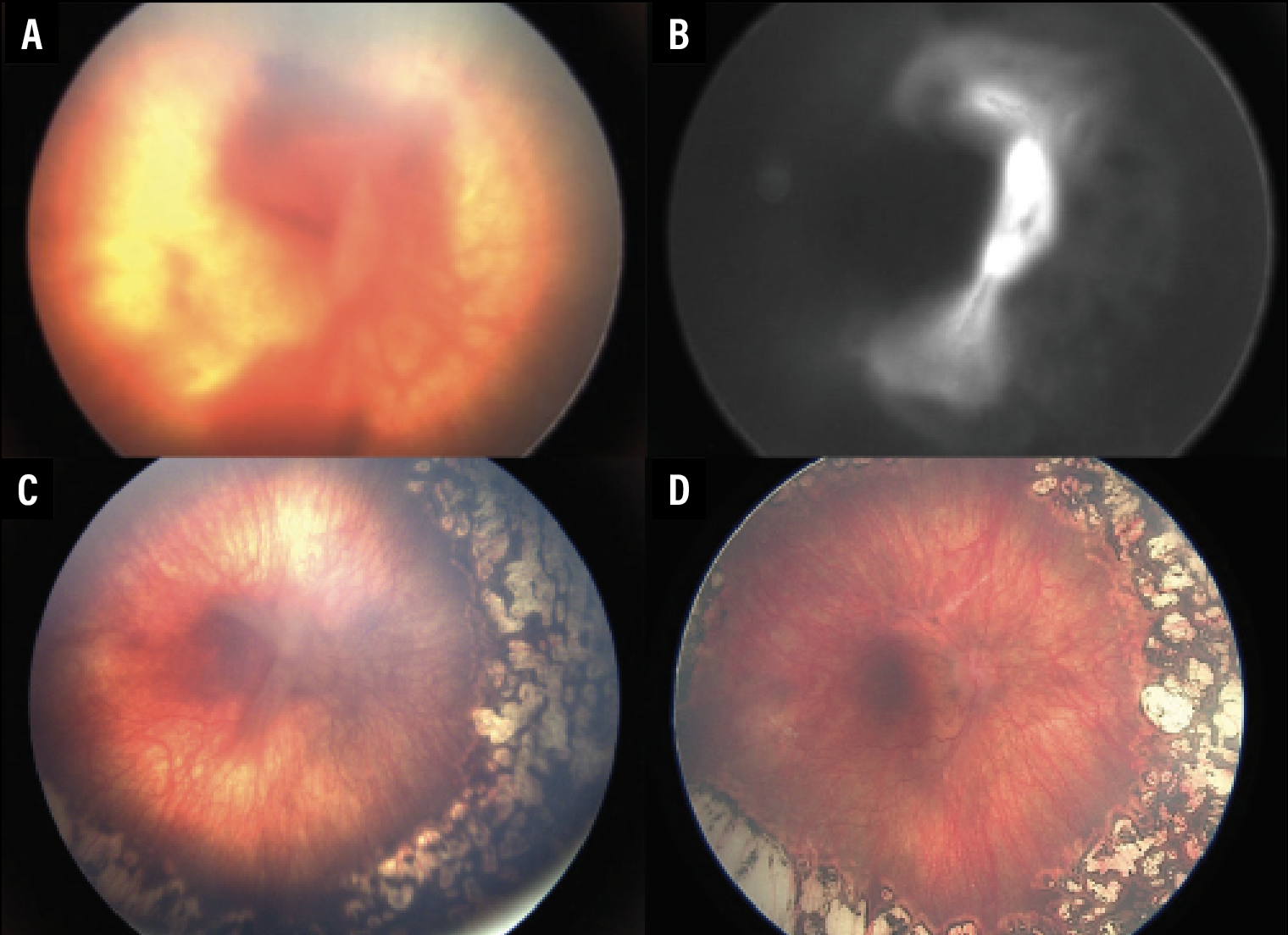 | Figure 2. Widefield fundus imaging of the right eye in a former 26-week-old premature baby with retinopathy of prematurity. A) The right eye shows stage 4 ROP. B) Fluorescein angiography shows leakage from the disc extending to the arcades. C) Vascular activity has decreased after an intravitreal bevacizumab injection, but the tractional retinal detachment persists as folds. D) The nicely flattened retina after lens-sparing vitrectomy with membrane peeling. |