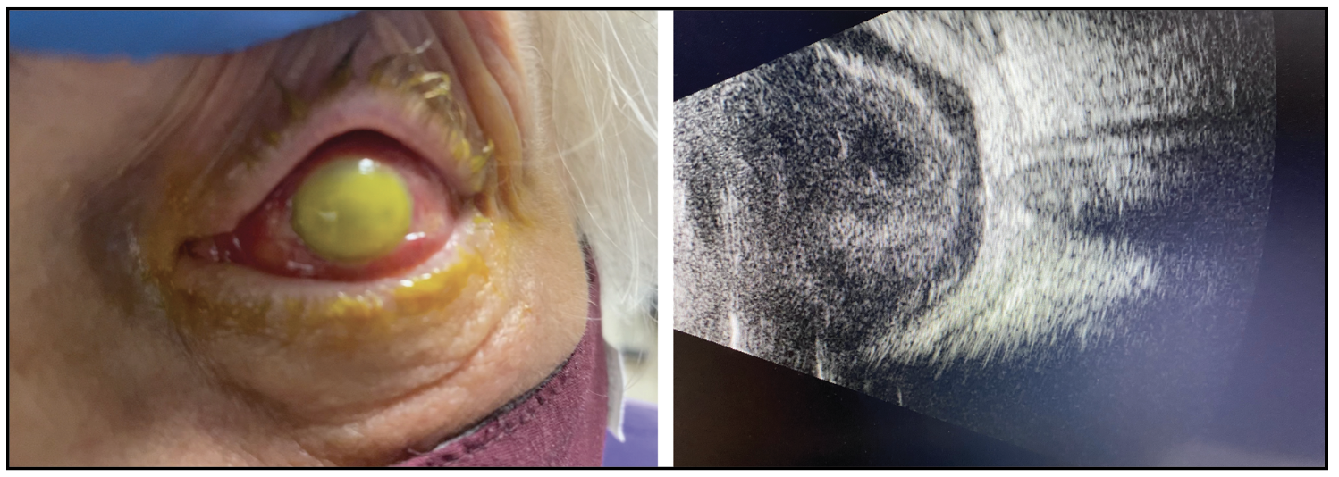 | Figure 3. External photograph and B-scan ultrasonography of a 71-year-old male patient who presented two days after intravitreal aflibercept injection with corneal opacification and dense vitritis. Baseline vision was light perception with minimal improvement after intravitreal antibiotics and topical therapy, therefore patient underwent surgery two days after presentation. Vitreous cultures ultimately grew Streptococcus mitis. |