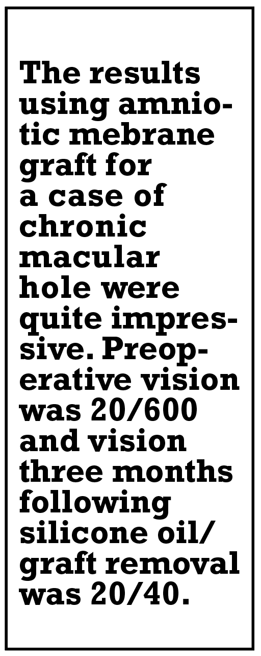 Three months later, the team returns to remove the silicone oil and amniotic membrane. The results from the case presented were quite impressive for a chronic macular hole. Preoperative vision was 20/600 and vision three months following silicone oil/graft removal was 20/40. They plan an upcoming case series detailing more patients in whom this technique has been used successfully for chronic macular holes.