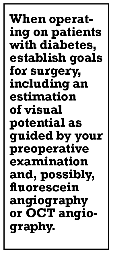 Improve your view. Clear visualization is of utmost importance, particularly when dealing with complex dissections and lengthy surgical procedures. Patients with diabetes often have friable corneal epithelium, so use the appropriate viscoelastic agents. For phakic patients, incorporating dextrose into the balanced salt solution infusion can minimize lens opacity during the operation. In more advanced cataracts, consider simultaneous cataract extraction to ensure a clear view for vitrectomy.