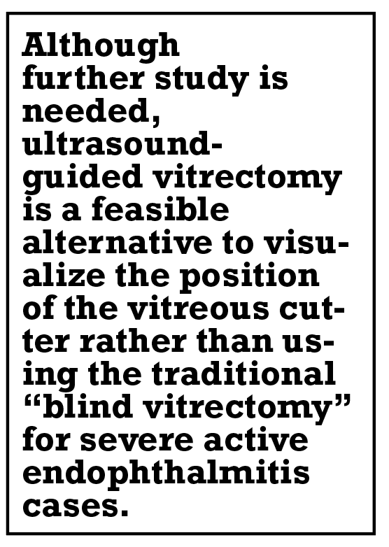 Eight patients (66 percent) achieved endophthalmitis inactivation, two ultimately required evisceration due to uncontrolled infection, and two developed retinal detachment at post-op weeks six and eight. Visual acuity at three months post-op had improved to 2.1 ± 0.25 logMAR (hand motions) in this small cohort. The adverse events during follow-up were likely related more to the severity of the endophthalmitis rather than the ultrasound-guided vitrectomy. Although further studies are needed, this approach is a feasible alternative to visualize the position of the vitreous cutter rather than using the traditional “blind vitrectomy” for severe active endophthalmitis cases.