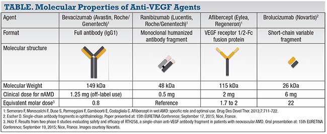 Newer anti-VEGF agents are under investigation that may require less frequent dosing, including brolucizumab (RTH258, Novartis)4 and abicipar pegol (Allergan and Molecular Partners).5