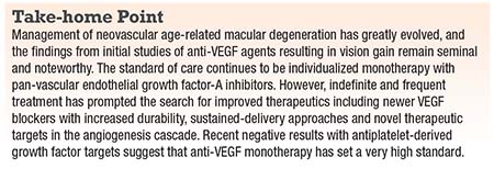 The much-anticipated results of combination therapy with inhibitors of PDGF, including Fovista (Ophthotech Corporation) and rinucumab (Regeneron) in combination with anti-VEGF therapy, have failed to show superiority over anti-VEGF alone.12