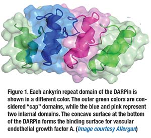 • Abicipar pegol. This is a DARPin, or designed ankyrin repeat protein (Figure 1, page 16)—a novel class of synthetic, small-binding proteins with high affinity and specificity that blocks all isoforms of VEGF-A, along with very long half-life of up to two weeks.5 In the Phase II REACH studies, intravitreal abicipar 2 mg monthly for three loading doses outperformed monthly intravitreal ranibizumab 0.5 mg (Lucentis, Roche/Genentech) at a 20-week endpoint, with the abicipar group gaining 9 letters and the ranibizumab group gaining 4.7 letters.