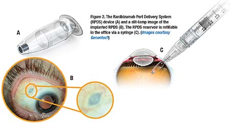 RPDS is a non-biodegradable intraocular reservoir that is inserted via a 3.2-mm pars plana incision in the operating room. It allows delivery of concentrated ranibizumab over four to six months (Figure 2).7 The 50-µl reservoir can be refilled in the office with a proprietary syringe to access the device. Phase I results have shown a vision gain comparable to monthly
