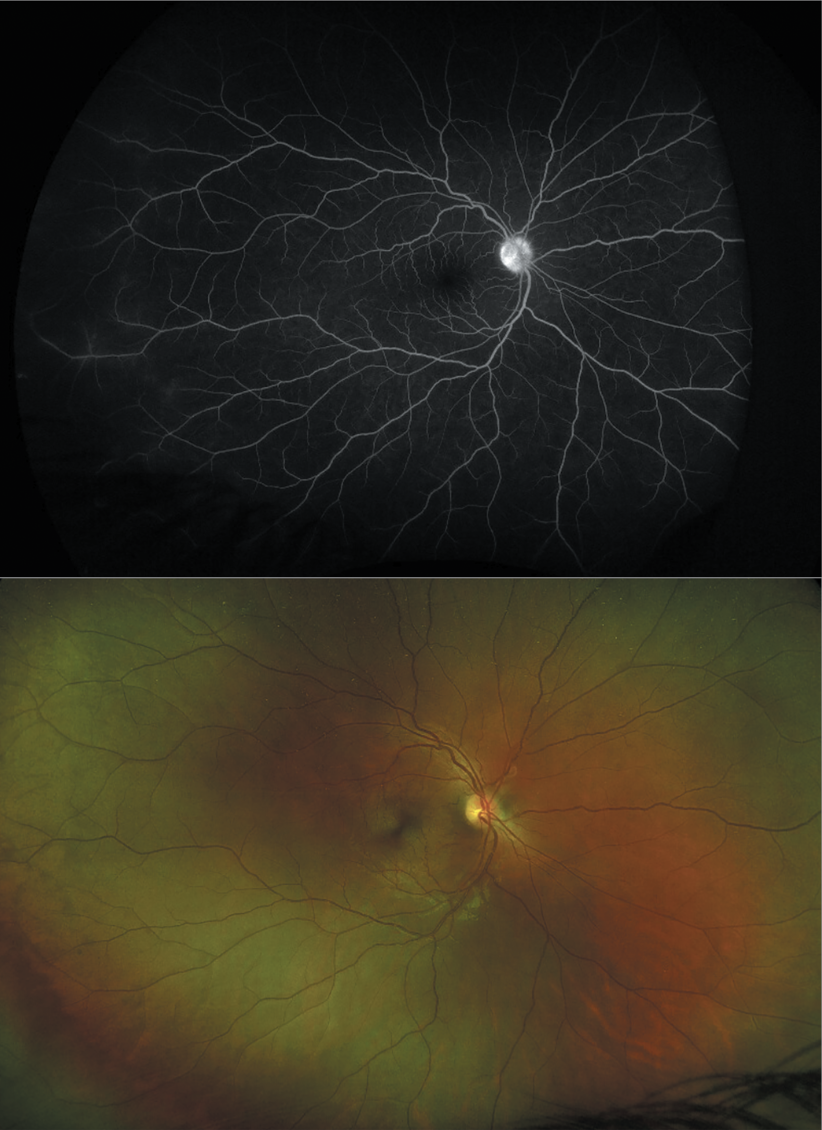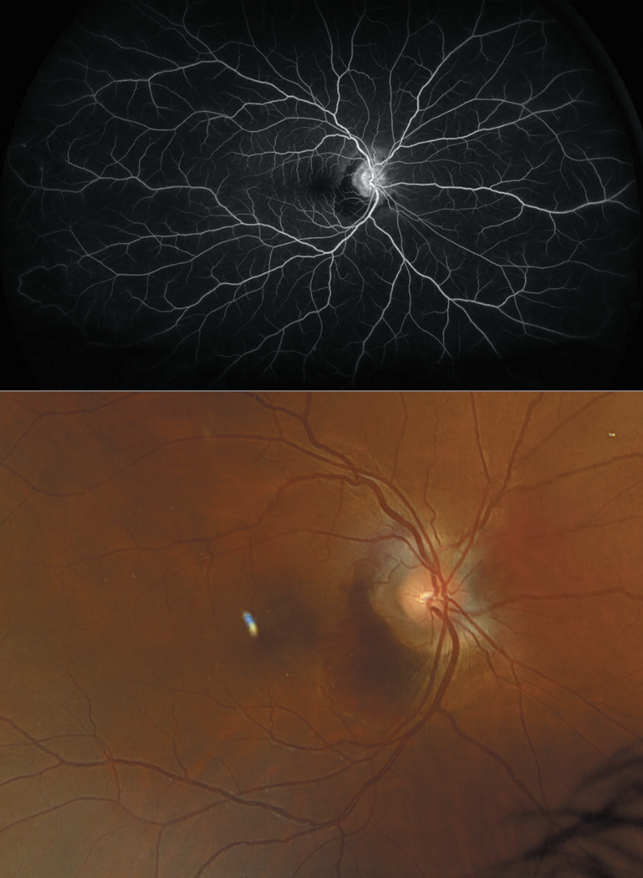 | Figure 2. Fluorescein angiogram is once again unremarkable beyond the MNV and blockage by the subretinal hemorrhage (top). The fundus photo taken at second presentation depicts peripapillary MNV with subretinal hemorrhage. |