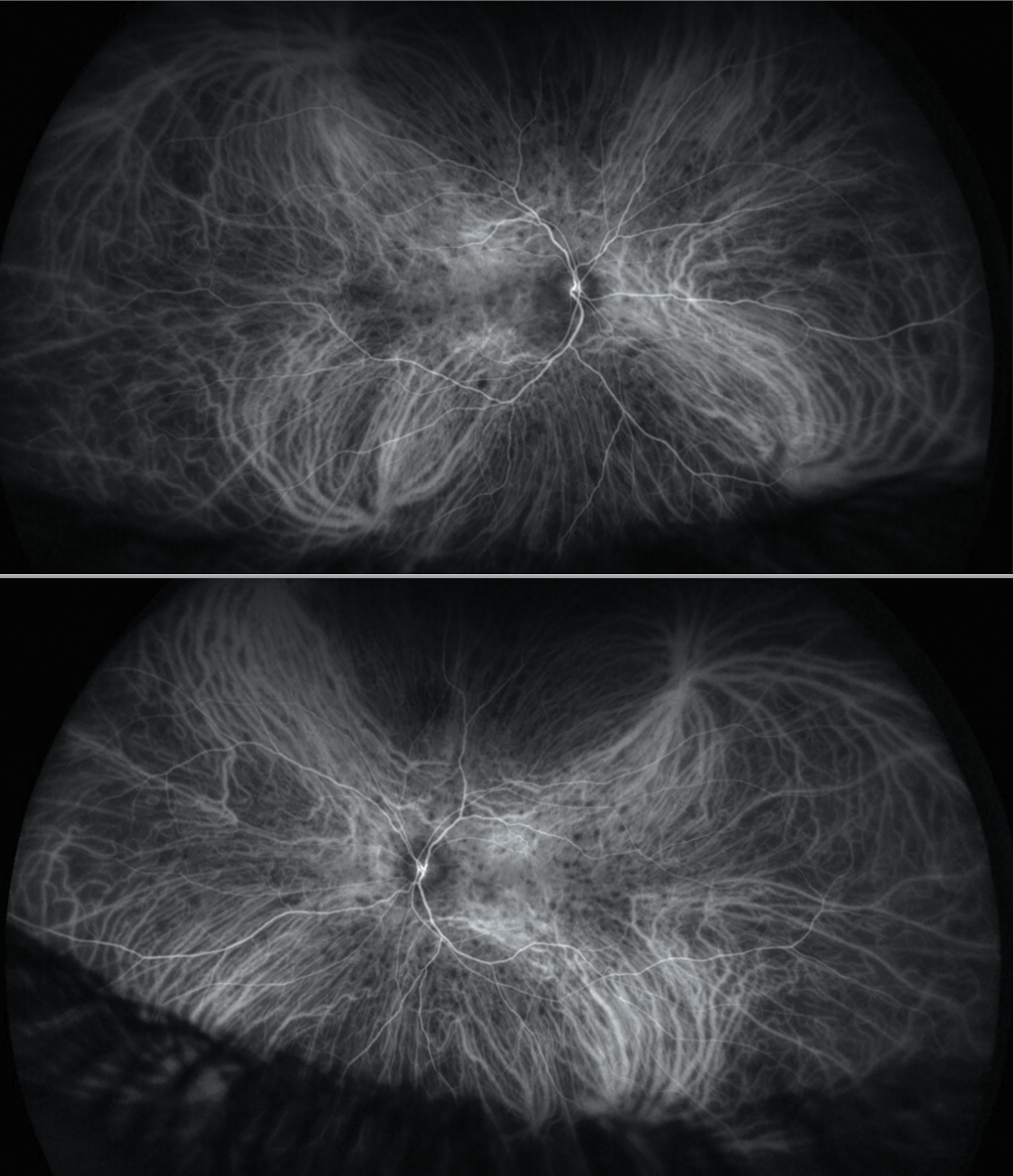 Repeat multimodal imaging was performed, this time including indocyanine-green angiogram. The FA confirmed the MNV but once again showed no vasculitis or disc leakage (Figure 2). However, the ICG angiogram revealed bilateral scattered small hypofluorescent lesions consistent with choroidal granulomas as are often seen in patients with sarcoid uveitis or tattoo- associated uveitis (Figure 3).