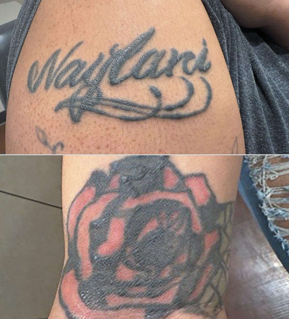 | Figure 4. Patient tattoos depict an elevated and symptomatically pruritic rash localized to the darkly pigmented tattoos. |