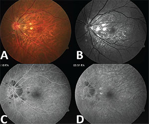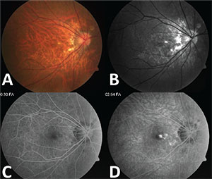 | Figure 2. Fundus photo of the right eye on follow-up with parafoveal hemorrhage (A) and red-free image with small parafoveal blockage (B). Early (C) and late (D) fluorescein angiography show late fovea-involving leakage consistent with choroidal neovascularization. |