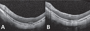 | Figure 3. Optical coherence tomography of the left eye with representative subretinal hemorrhage before (A) and six weeks after (B) intravitreal anti-VEGF injection demonstrating resolution of subretinal hemorrhage and responsiveness to therapy. |