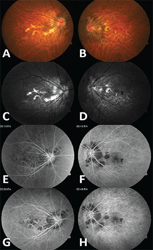 | Figure 4. Fundus photos of the right (A) and left (B) eyes and red-free image of the right (C) and left (D) eyes from a more recent visit demonstrate bilateral, macula-involving chorioretinal atrophy compared to initial evaluation seven years prior (Figures 1 and 2) and a small amount of intraretinal hemorrhage in the left eye. Early fluorescein angiography (FA) of the right (E) and left (F) eyes and late FA of the right (G) and left (H) eyes demonstrate window defects and staining in the right eye and window defects and blockage in the left. |
