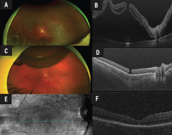 | Figure 1. Representative case of a 62-year-old patient with a rhegmatogenous retinal detachment with several breaks in the temporal quadrant and a full-thickness macular hole in the right eye (A-B). The preoperative gas for pars plana vitrectomy or “PGP technique” was used, followed by laser retinopexy at 48 hours (C-D). The patient also underwent pars plana vitrectomy with inverted internal limiting membrane flap technique within one week. Postoperatively, this complex case had a good anatomical outcome (E-F). |
