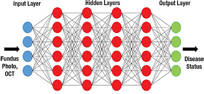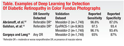 Michael Abràmoff, MD, PhD, and colleagues at the University of Iowa demonstrated in 2016 that the addition of deep-learning methods to an existing DR detection algorithm resulted in greatly improved performance for detection of referable DR.9 Shortly thereafter, investigators from Google published a report describing results achieved with a deep-learning algorithm trained by using over 100,000 images to identify referable DR.10 The algorithm was validated using two independent datasets (EyePACS-1, n=9,963; and Messidor-2, n=1,748), and the majority opinion of a panel of ophthalmologists as a reference standard. Impressively, at an operating point selected for sensitivity, sensitivity was 97.5 percent and 96.1 percent and specificity was 93.4 percent and 93.9 percent for EYEPACS-1 and Messidor-2, respectively. This year, Rishab Gargeya, a Davidson Fellows Scholar, joined Theodore Leng, MD, MS, at Byers Eye Institute, Stanford University, to demonstrate that automated detection of DR using deep learning can be extended to include detection of mild DR, in addition to referable DR.11
