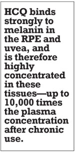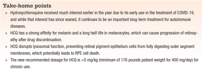 HCQ binds strongly to melanin in the RPE and uvea, and is therefore highly concentrated in these tissues—up to 10,000 times the plasma concentration after chronic use.9 A primary mechanism of action for HCQ is that it interferes with lysosomal function, specifically autophagy. It interferes with the ability of RPE cells to digest photoreceptor residue, leading to accumulation in lysosomes. Oxidation of the lysozymal product results in lipofuscin formation; its accumulation causes RPE dysfunction.10