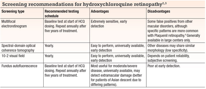 Screening for HCQ retinopathy should include multifocal electroretinography and fundus autofluorescence when therapy starts, then yearly after five years of treatment, along with annual spectral-domain optical coherence tomography and 10-2 visual fields after therapy starts (Table).