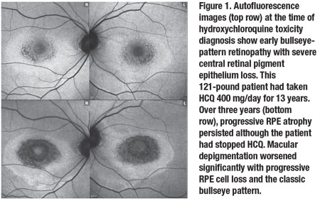 Mihai Mititelu, MD, MPH, and colleagues studied qualitative vision changes in their HCQ patients.5 Five of their seven patients had complaints relating to night vision and blind spots, and declining visual acuity. Most of the symptoms developed after anatomic changes had occurred.