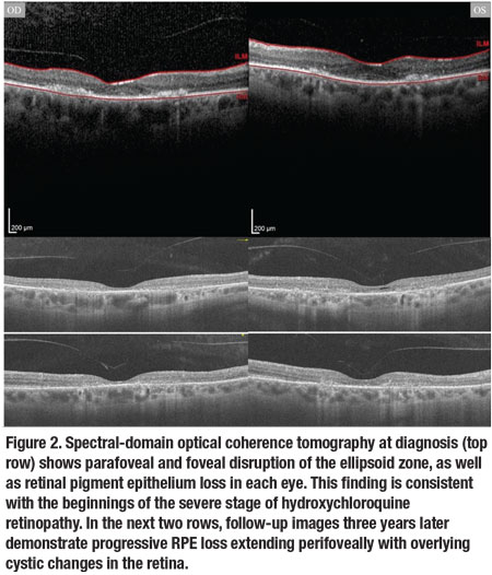 The same researchers also found HCQ to be an inhibitor of at-ROL uptake by OATP1A2.12 Excess at-ROL accumulation is then converted to lipofuscin. Progressive lipofuscin formation leads to continued lysosomal dysfunction and photoreceptor degeneration.13 The long half-life of HCQ (40 to 60 days) and high concentration in the RPE cells can result in progressive retinopathy long after drug cessation.8
