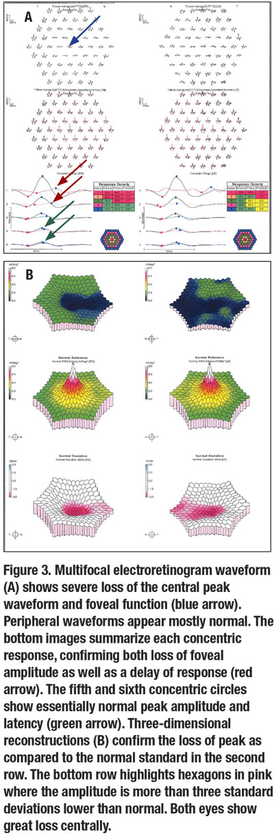 Almost all nine subfields of the macular thickness map for both eyes showed thinning (Figure 3A, page 37). Multifocal ERG confirmed significant loss of foveal function with decreased central waveforms in each eye (Figure 3B).