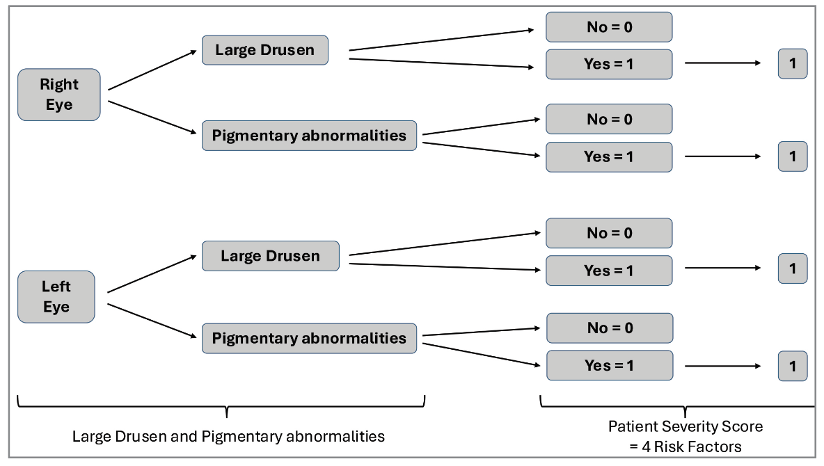 Risk prediction is an essential task in non-advanced age-related macular degeneration. It’s important for patient counseling, personalized follow-up, reimaging, home monitoring plans and tailored recommendations of medical interventions. However, different approaches are appropriate in different settings.1–3 For clinical practice, approaches that prioritize simplicity and ease of use are typically most suitable. For that reason, exactly 20 years ago, the Age-Related Eye Diseases Study Research Group developed the AREDS Simplified Severity Scale for AMD.3 The idea was to provide a readily accessible severity scale for non-advanced AMD, so that clinicians could assign five-year progression risk levels that are easy to remember, based on simple grading achievable with either clinical examination or color fundus photography.