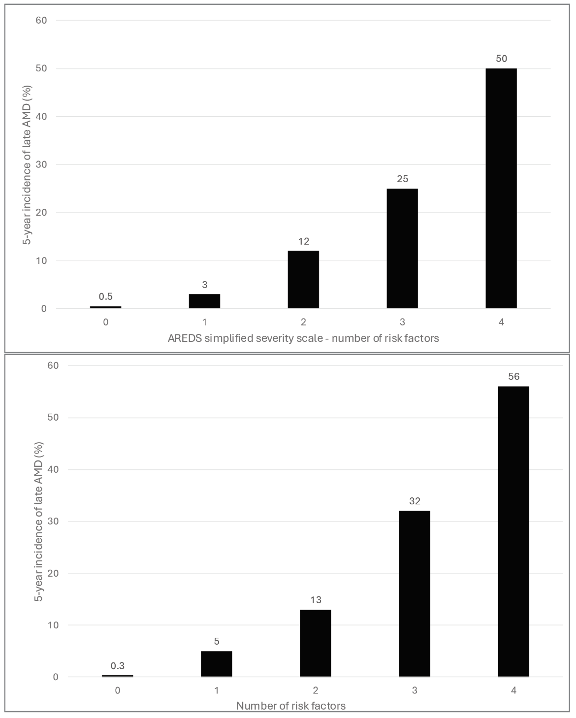 | Figure 1. The original AREDS AMD Simplified Severity Scale showing risk factor scoring and progression rates. Each eye is graded separately for large drusen and pigmentary abnormalities, based on clinical examination or color fundus photography, for a final score of 0-4 between both eyes. From this score, the five-year risk of progression to advanced age-related macular degeneration in either eye is read off the chart. |