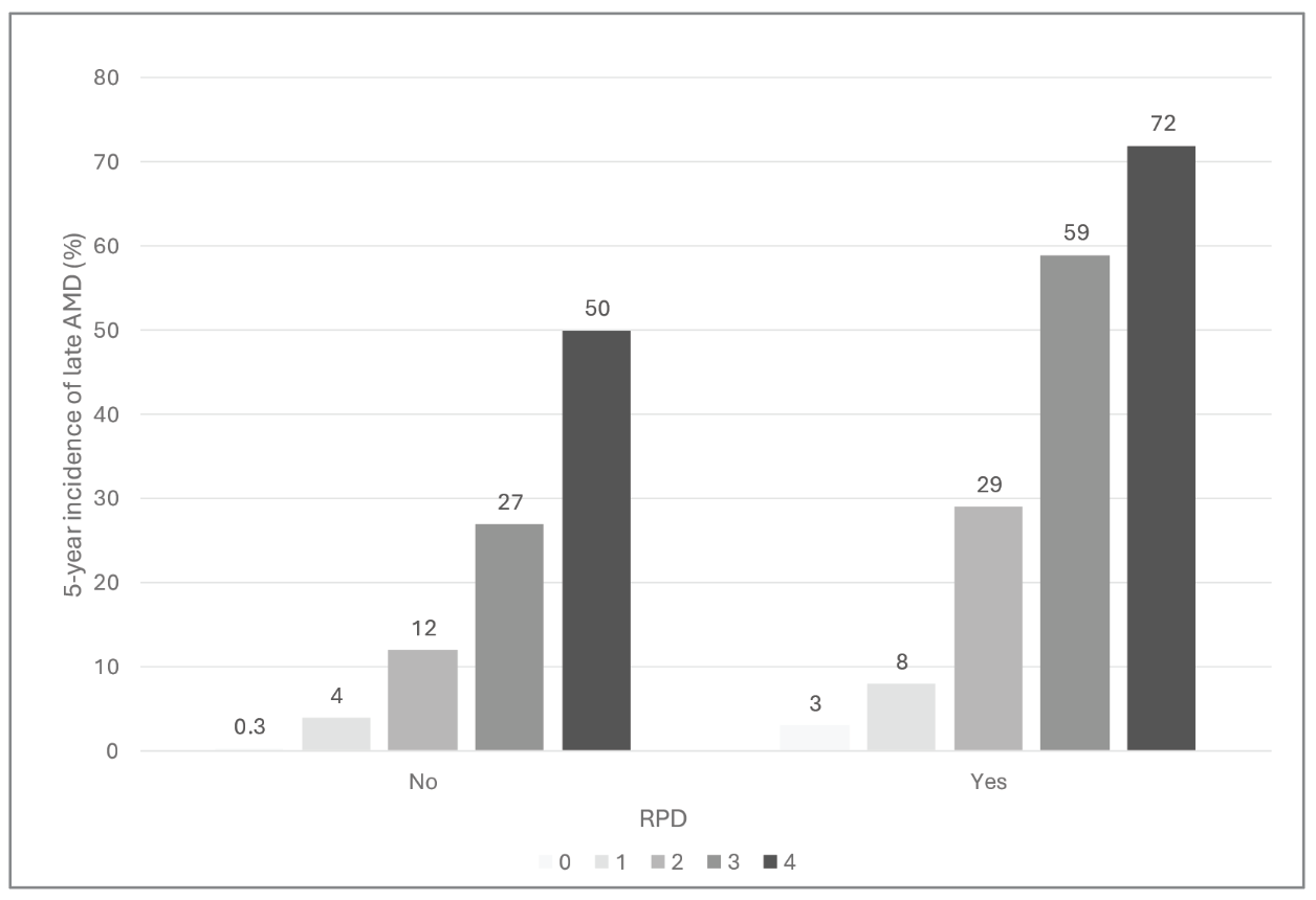 For individuals without RPD, the risk estimates are approximately 0.5, 4, 12, 25 and 50 percent for levels 0-4. Fortuitously, these estimates are almost identical to the numbers from the original version. Of note, the scale retains the characteristic doubling from 12 percent to 25 percent to 50 percent, which makes the estimates easy to remember. In practice, this means that the original scale can still be used, provided the patient in question doesn’t have RPD in either eye.