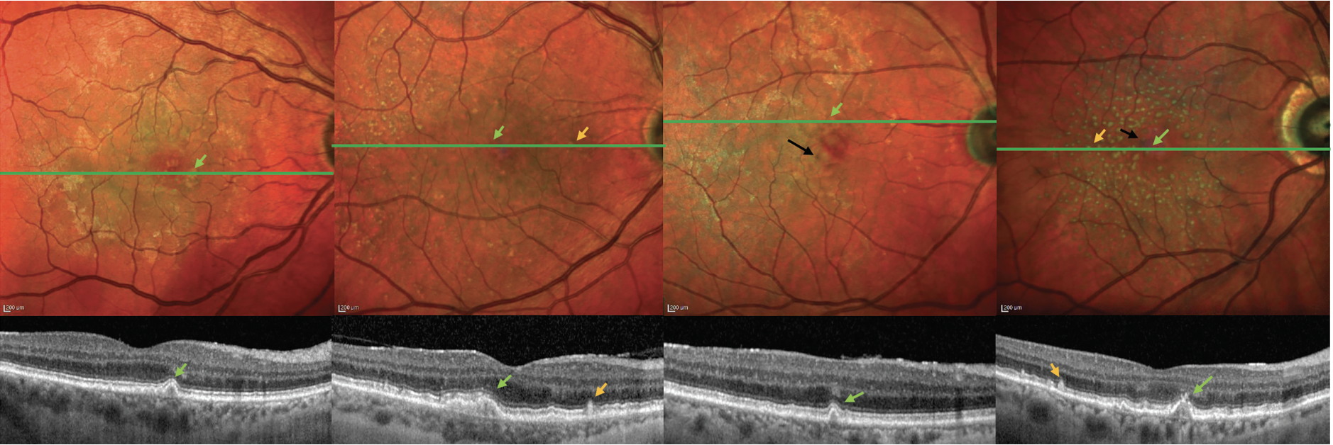 | Figure 4. Example cases, with and without reticular pseudodrusen, representing different levels of risk in the final Simplified Severity Scale. MultiColor confocal scanning laser ophthalmoscopy images with accompanying optical coherence tomography line scans, showing four representative eyes, with their five-year risks of progression to late age-related macular degeneration, based on the assumption of similar features in both eyes. (A) large drusen (green arrows), without RPD: 12 percent; (B) large drusen, with RPD (orange arrows): 29 percent; (C) large drusen and pigmentary abnormalities (black arrows), without RPD: 50 percent; (D) large drusen and pigmentary abnormalities, with RPD: 72 percent. |
