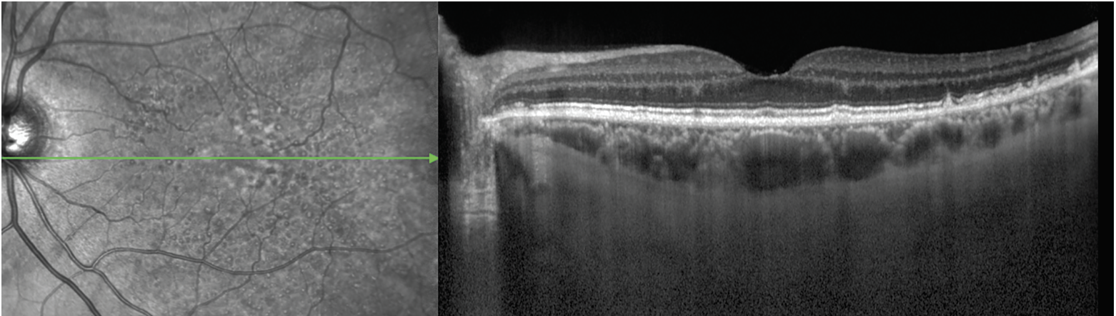| Figure 5. Reticular pseudodrusen on near-infrared reflectance (left) and optical coherence tomography (right) imaging. The NIR image demonstrates the RPD as an extensive interlacing network of hyporeflective lesions surrounding by areas of hyperreflectivity. Some lesions have a target appearance. The OCT image shows the RPD as hyperreflective material above the retinal pigment epithelium, particularly in the far temporal macula. Some lesions are seen as mounds of hyperreflective material that alter the ellipsoid zone (EZ, i.e., stage 2), whereas others are conical and break through the EZ (i.e., stage 3; green arrow). Temporal to the fovea, soft drusen are also observed, comprising nonconical lesions of hyperreflective material below the RPE. |
