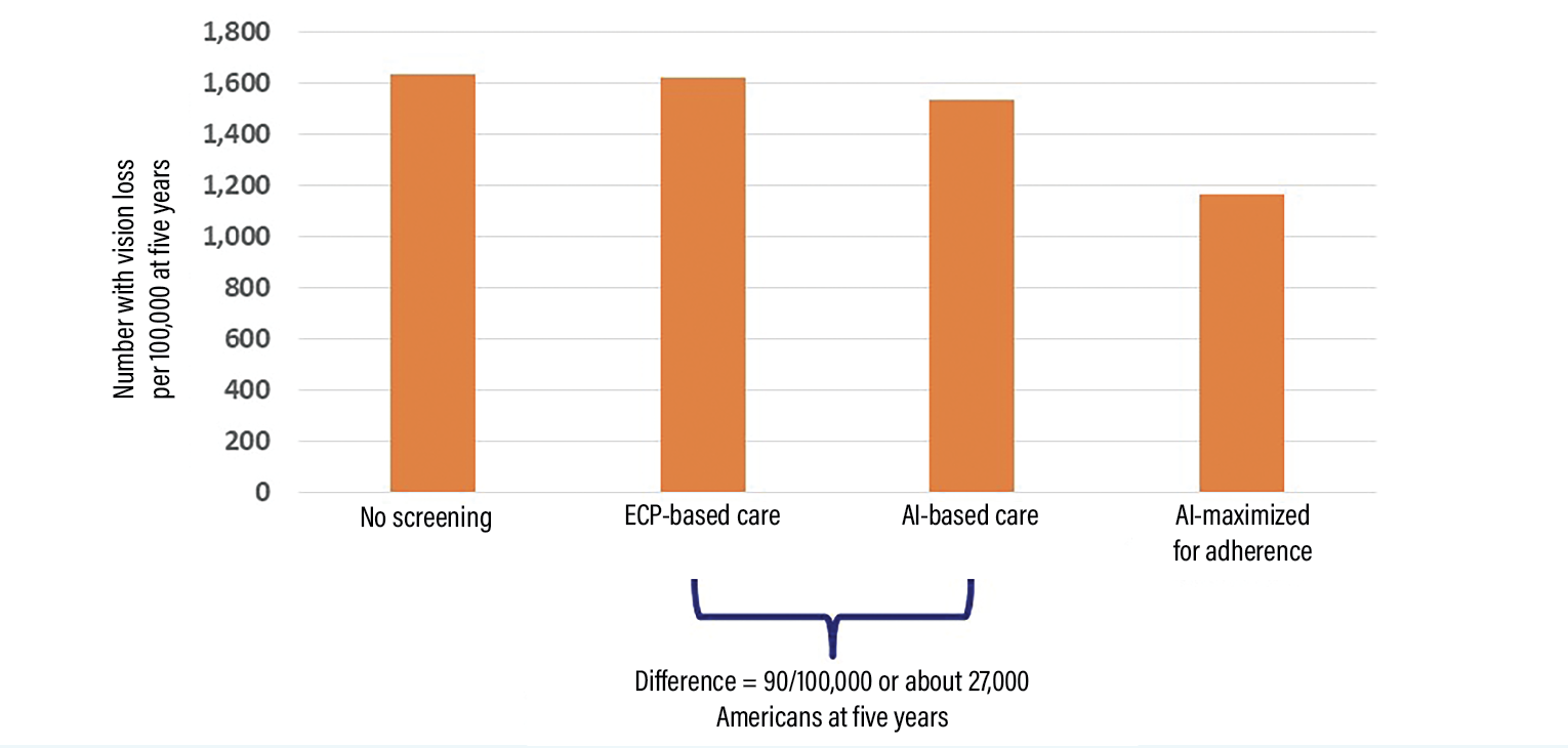 Our team developed a simulation to estimate vision loss prevented using eye-care provider vs. AI-based screening. The model showed that if AI were to replace the current eye-care provider-based system of screening, severe vision loss could be prevented in 90/100,000 individuals with diabetes at five years (Figure 1). This translates to at least 27,000 Americans over five years, assuming 34 million Americans have diabetes.27