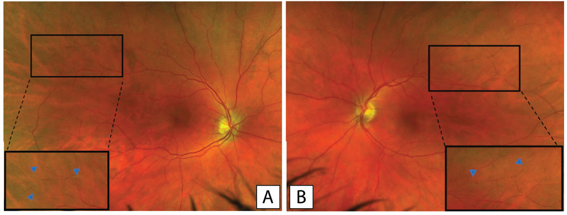 Figure 1. Pseudocolor fundus photography of the right (A) and left (B) eyes respectively with a magnified view showing bilateral artery attenuation and arrows pointing to the Gass plaques. |