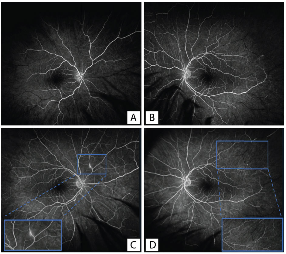 Fluorescein angiography can also be a helpful modality for diagnosis and treatment. Typical findings were reported in 2007,4 including GPs and arterial wall hyperfluorescence (AWH), which can also be seen in the case presented here (Figure 2). In addition, the FA can be useful to evaluate areas of non-perfusion and neovascularization, which may guide preventative treatment with PRP.