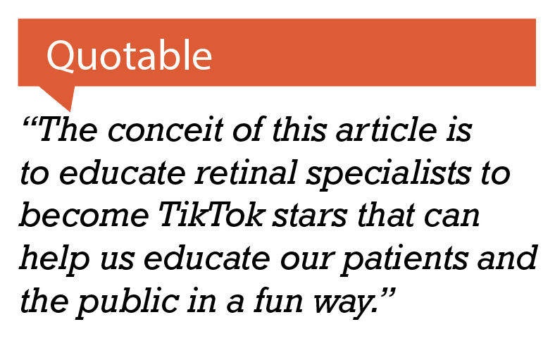 TikTok’s impact is so profound that it has spread into ophthalmology. If we dig into the literature, there have been a few ophthalmology studies examining its impact. Tiffany Cheng and her co-workers1 from the Albert Einstein College of Medicine in New York described 386 oculoplastic-related videos on the platform with over 218 million views. Ironically, they discovered that not only were patients the most likely group to post these videos, but also that oculoplastic surgeon-created videos were the least likely to be shared. As you would expect, physician content was statistically more likely to be understandable.