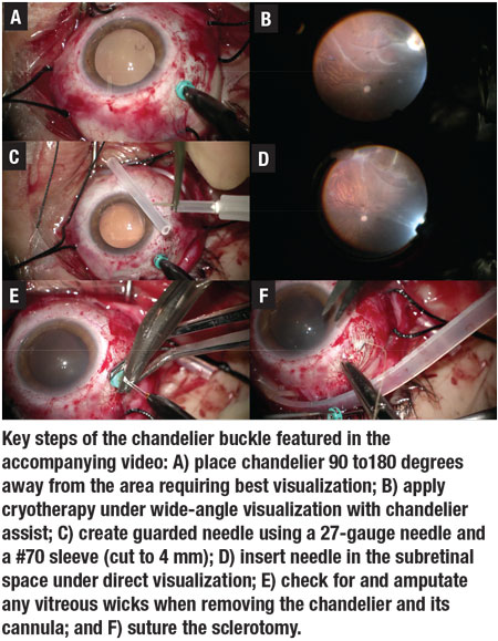 Primary scleral buckle surgery is an important skill for any vitreoretinal surgeon. The use of chandelier illumination during scleral buckle surgery coupled with a microscope-based wide-angle viewing system (“chandelier buckle”) is increasing in popularity. For those interested in exploring this technique or refining their skills, we present six considerations for successful chandelier buckling (Figure).