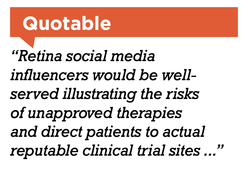 For retina, what are the likely areas we can add to the conversation in a meaningful way? We should consider unmet needs or areas of frustration for our patients. One well-described cohort are patients with end-stage macular degeneration (wet or dry) looking for solutions and vulnerable to predatory stem cell “clinics” trying to sell dangerous snake oil type interventions in exchange for large monetary reward. Retina social media influencers would be well-served illustrating the risks of unapproved therapies and direct patients to actual reputable clinical trial sites that may have options. Another group that needs our input are patients with typical symptoms concerning for retinal detachment; how often do we see patients finally referred to surgical retina clinics who are already mac-off for a week or more? Good social media descriptions on the importance of recognizing flashes and floaters and seeking appropriate eye exams exist and yet, we need to do more work to get these posts and videos pushed up by application algorithms to the public.