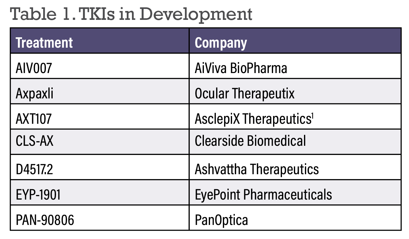 Highly encouraging results from numerous tyrosine kinase inhibitor clinical development programs are providing increasing levels of confidence that this new class of molecules may advance the treatment landscape for wet age-related macular degeneration and diabetic macular edema. Although patient outcomes have improved tremendously in the anti-VEGF era, challenges remain in terms of the need for frequent ongoing therapy in populations of elderly patients and diabetics, both of whom may struggle to maintain adherence to the prescribed treatment regimen.20