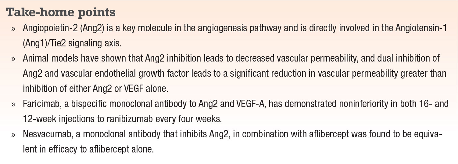 Faricimab, a bispecific monoclonal antibody to Ang2 and VEGF-A, has now gone through two Phase II trials, which have demonstrated noninferiority in both q16-and q12-week injections compared with q4-week ranibizumab when evaluating BCVA and CST.