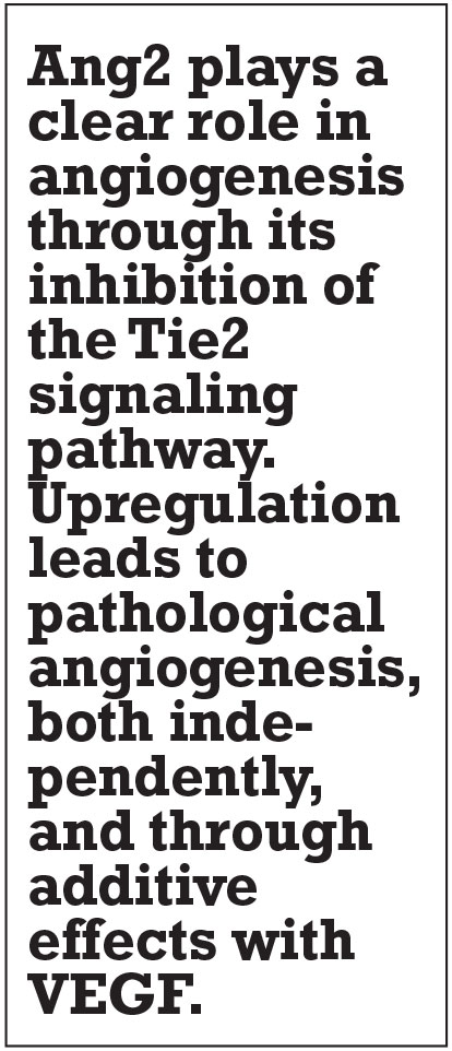 Angiopoietin-2 (Ang2) is a key molecule in the angiogenesis pathway and is directly involved in the Angiotensin1 (Ang1)/Tie2 signaling axis. Ang2 is produced almost exclusively by endothelial cells and functions as a vessel-destabilizing molecule through its competition with Ang1 and inhibition of Tie2.6 The central role of Ang2 in the angiogenesis cascade has led to intense exploration for the development of anti-