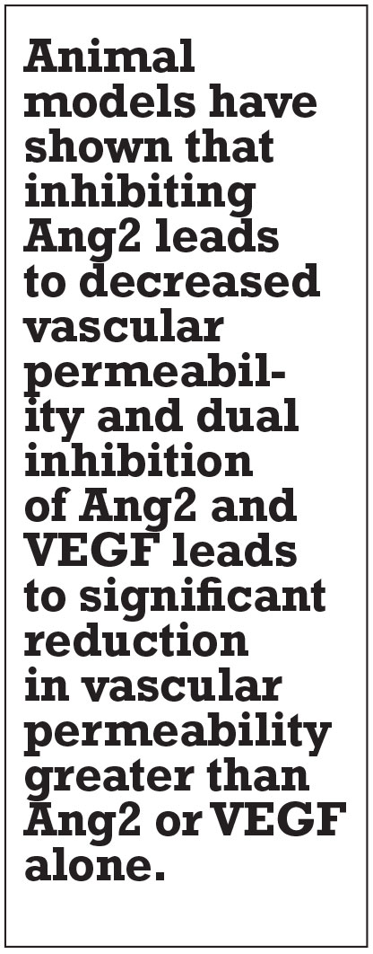 In 2016, researchers in Europe tested this theory of improved therapeutic benefit of combined inhibition of VEGF and Ang2.15 Utilizing a mouse model of aberrant retinal angiogenesis, they demonstrated that dual inhibition of VEGF-A and Ang2 significantly reduced vascular leakage when compared to not just controls, but also when compared to either Ang2 or VEGF inhibition alone.
