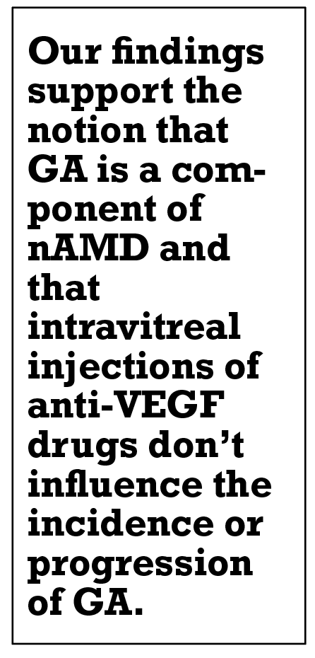 Additionally, we found that the frequency of injections and the type of anti-VEGF agent used for nAMD treatment weren’t associated with GA progression, which seems to be primarily related to the type of neovascular membrane underlying the nAMD.