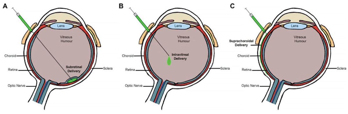 Figure 1. Routes of ocular gene therapy administration: subretinal delivery (A); intravitreal delivery (B); suprachoroidal delivery (C). From Guimaraes TAC, Georgiou M, Bainbridge JWB, Michaelides M. Br J Ophthalmol. 2021;105(2):151-157.11 Licensed for reuse under the Creative Commons Attribution (CC BY) license. |