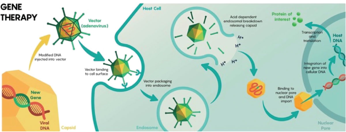 Figure 2. Overview of adenovirus-mediated delivery of recombinant genetic material to host cells for endogenous expression of a desired protein. (From: https://commons.wikimedia.org/wiki/File:Viral_mediated_delivery_of_genes_to_neurons_1.jpg.16 Licensed for reuse under the Creative Commons Attribution-Share Alike 4.0 International license.) |