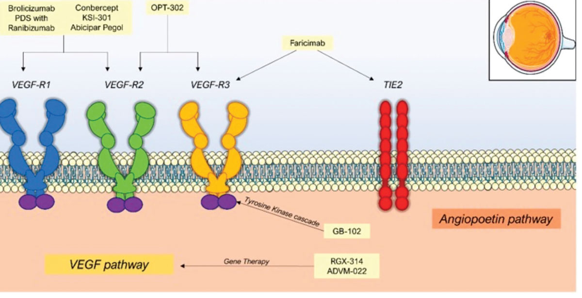 4D-150 (4D Molecular Therapeutics) is a single-use, low-dose intravitreal gene therapy using an evolved vector, R100, and a transgene cassette that expresses both aflibercept and a VEGF-C inhibitory RNAi to inhibit a total of four antiangiogenic factors: VEGF A; B; C; and placental growth factor (PlGF).24