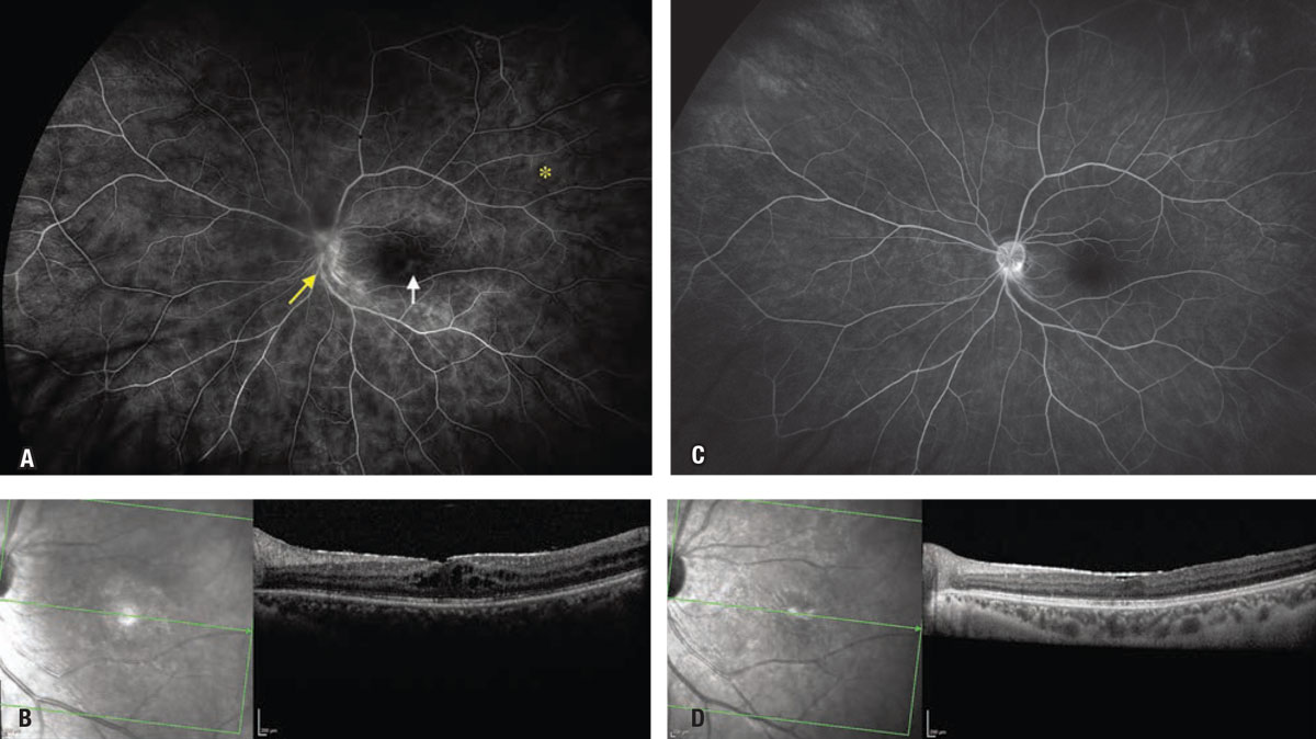 | Figure 1. A) Late-phase fluorescein angiography of a 25-year-old patient with active chronic intermediate uveitis showing diffuse small vessel non-occlusive retinal vasculitis (asterisk) and disc leakage (yellow arrow) with associated cystoid macular edema (white arrow). B) Optical coherence tomography image of the patient’s CME. C) Late-phase FA of the same patient after uveitis control was achieved via treatment with intravitreal corticosteroid shows resolution of the CME and small-vessel vasculitis, but mild residual disc leakage. D) OCT of the patient’s retina after CME resolution. An epiretinal membrane and retinal atrophy are structural consequences of previous chronic disease activity. |