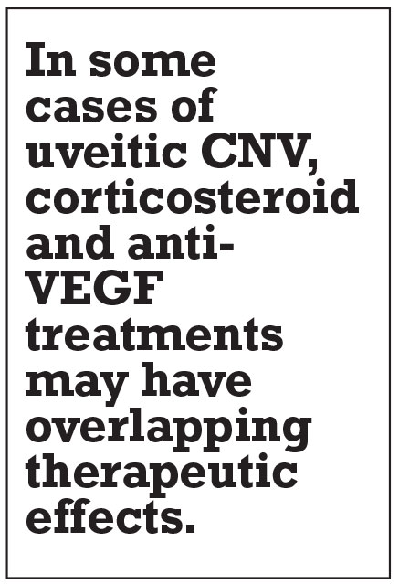 Angiogenesis in CNV is a complex process in which inflammatory mediators play a critical role.17 In some cases of uveitic CNV, corticosteroid and anti-VEGF treatments may have overlapping therapeutic effects.