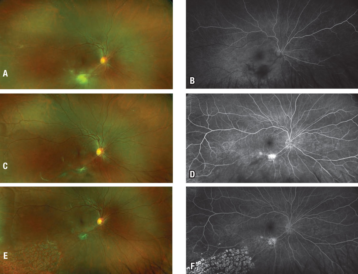 | Figure 2. A) Pseudocolor fundus photo of a 32-year-old patient with primary acquired toxoplasmosis retinochoroiditis with an associated occlusive arteriolar vasculitis resulting in an inferior branch retinal artery occlusion. B) Early phase fluorescein angiography demonstrates a large area of inferotemporal retinal nonperfusion. C) Pseudocolor fundus photo after treatment with oral trimethoprim-sulfamethoxazole and oral prednisone demonstrates resolution of the retinochoroiditis and new retinal neovascularization with vitreous hemorrhage. D) Late-phase FA demonstrates an area of RNV. E,F) Pseudocolor image and FA of RNV regression and resolved vitreous hemorrhage after scatter laser photocoagulation and intravitreal bevacizumab. |