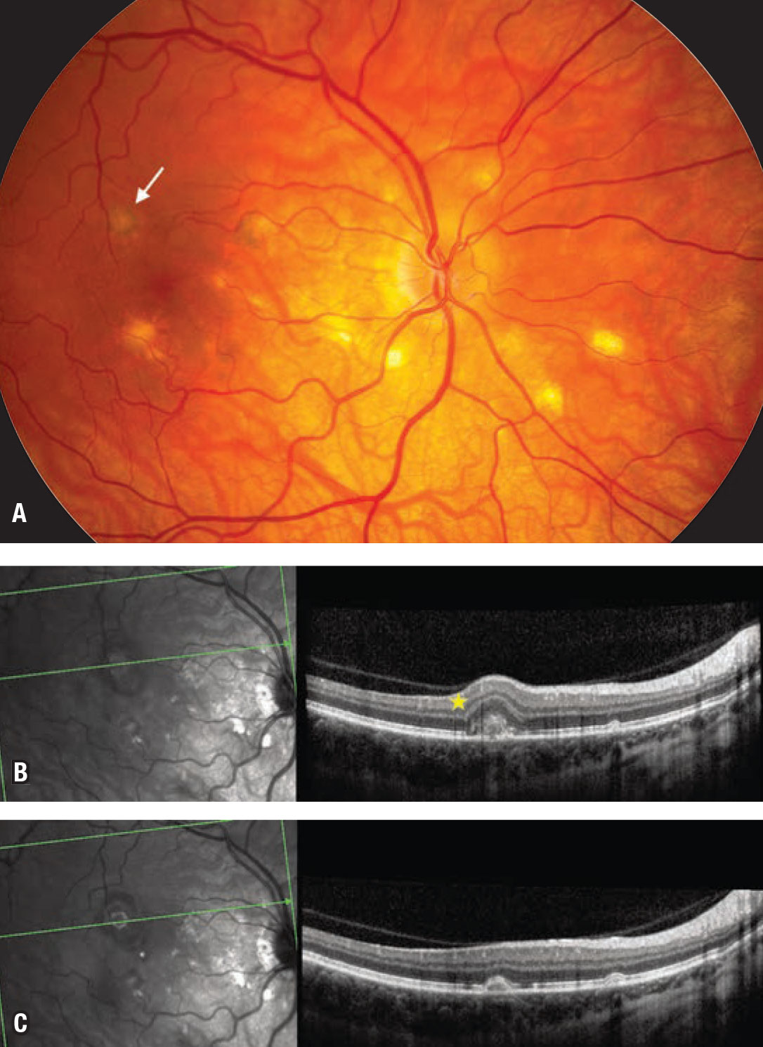 | Figure 3. A) Color fundus photo of a 43-year-old myopic female with punctate inner choroiditis who noticed an increase in one of her small blind spots in the inferonasal sector, which manifested as a greenish gray subretinal lesion (arrow). B) Optical coherence tomography reveals a choroidal neovascular membrane with heterogeneous dome-shaped subretinal hyperreflective material and ellipsoid zone disruption, and a break in Bruch’s layer with choroidal hyper-transmission, indicating retinal pigment epithelium/photoreceptor disruption (star). C) An inactive lesion in the nasal macula. After a series of three intravitreal bevacizumab injections four weeks apart, the choroidal neovascularization became inactive and symptoms resolved. |