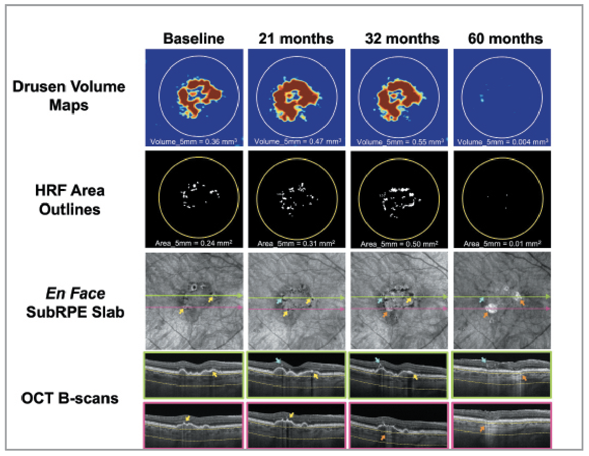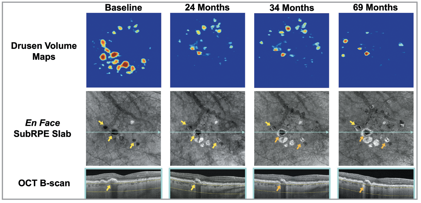 More recently, Liu et al.8 used swept-source OCT angiography and an automated algorithm for measuring drusen volume and identifying large hypertransmission defects (hyperTDs). Large hyperTDs represent an early structural sign of impending GA, and this OCT biomarker is now FDA-approved as a clinical trial endpoint for studying the progression from iAMD to GA. Large hyperTDs are defined as bright areas at least 250 µm in greatest linear dimension identified on en face sub-retinal pigment epithelium slabs with boundaries positioned 64 µm to 400 µm beneath Bruch’s membrane. The use of en face images derived from dense macular raster scans allows for the simultaneous evaluation of multiple biomarkers without the need to scroll through every B-scan. Using longitudinal data from a prospective cohort of iAMD eyes, the researchers8 used drusen volume to identify eyes at higher risk of disease progression and designed a clinical trial to test therapeutic strategies targeting hyperTD formation and growth.