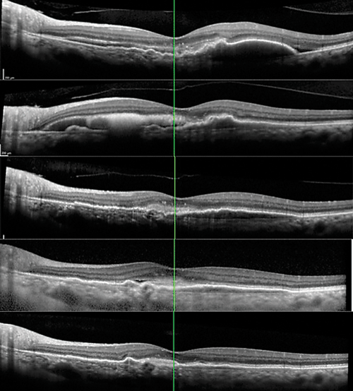 | Figure 2. Progression of optical coherence tomography raster scans through the fovea at (A) presentation before treatment in our clinic; (B) one month after presentation and after one injection of bevacizumab; (C) four months after presentation, after three bevacizumab and one aflibercept injections; and (D) 12 months after the initial visit, after three bevacizumab and fi veaflobercept injections and one photodynamic therapy session. Thirteen months after presentation and an additional aflibercept injection, the most recent image (E) showed flattening of the shallow pigment epithelial detachment central macula, and resolution of the subretinal fluid. |