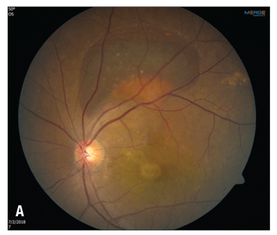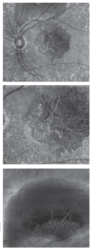 The patient had OCT angiography approximately one year into treatment so we could characterize the choroidal neovascular membrane. The right eye appeared normal, but the left eye showed two large branching networks of neovascular vessels in the sub-RPE space (Figure 4, page 17). One focus was located in the central macula and another at the inferior border of the PED along the superior arcade.