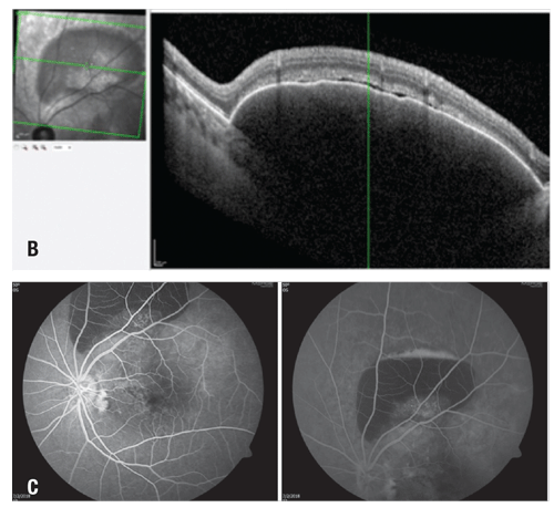 Fluorescein angiography with transit in the left eye showed normal transit time and vascular filling. However, there was blockage throughout the macula due to the subretinal hemorrhage. Late pooling was noted superiorly within the most temporal part of the PED. Diffuse and pinpoint leakage was also observed in the macula (Figure 1B). Optical coherence tomography of the left eye showed large serous PEDs with shallow surrounding SRH in the macula and along the superior arcade. Subretinal fluid (SRF) was also noted (Figure 1C).
